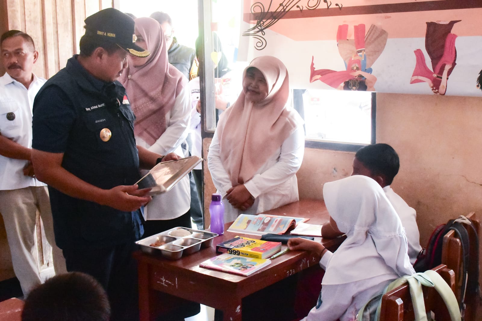 Selain memantau pembagian makanan bergizi, Bupati Dony juga berinteraksi langsung dengan para siswa dan guru, serta meninjau kondisi sarana dan prasarana sekolah. Saat berkeliling, beliau menemukan beberapa bagian atap ruang kelas yang mulai bocor dan langsung memberikan instruksi kepada pihak terkait agar segera dilakukan perbaikan.